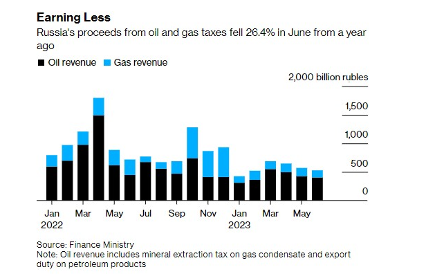 由于原油價格下跌和歐洲天然氣供應(yīng)受限,俄羅斯上月油氣收入縮水逾四分之一。俄羅斯財政部表示,6月來自石油和天然氣稅的預(yù)算收入同比下降26%,至約5290億盧布(合58.4億美元)。其中,天然氣稅的預(yù)算收入下降了54%,至1257億盧布,而原油和石油產(chǎn)品的收入(占碳?xì)浠衔锸杖氲?6%以上)下降了近十分之一,至4028億盧布。
