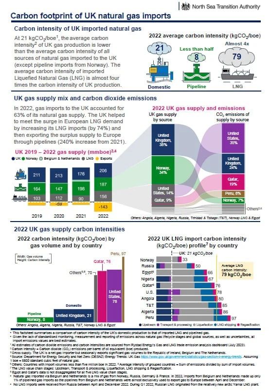 NSTA的報告顯示,英國約63%的天然氣供應是進口到該國的,2022年,英國本國生產(chǎn)了38%的天然氣供應,總計 206 mmboe。根據(jù)這一分析,38%只占與天然氣供應相關的總排放量的24%,而來自美國的液化天然氣盡管僅占供應量的14%,但占排放量的35%。